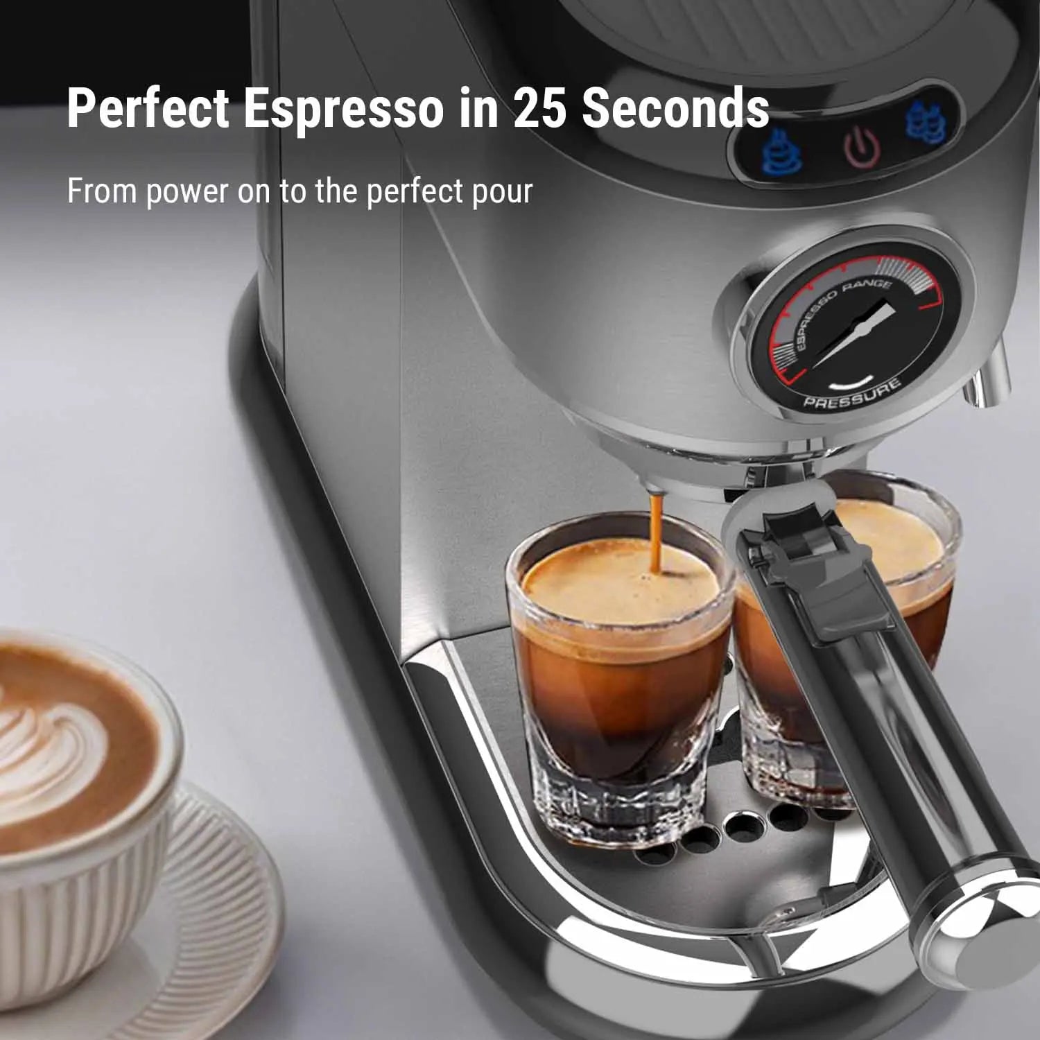 See 20 Bar pressure live on the dial. This rock-steady pressure yields complete extraction and deep, velvety crema shot after shot.