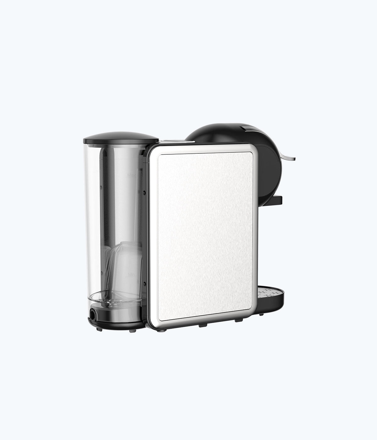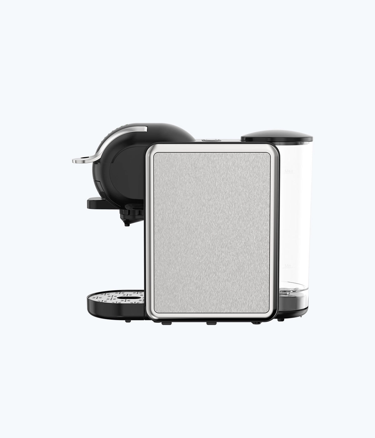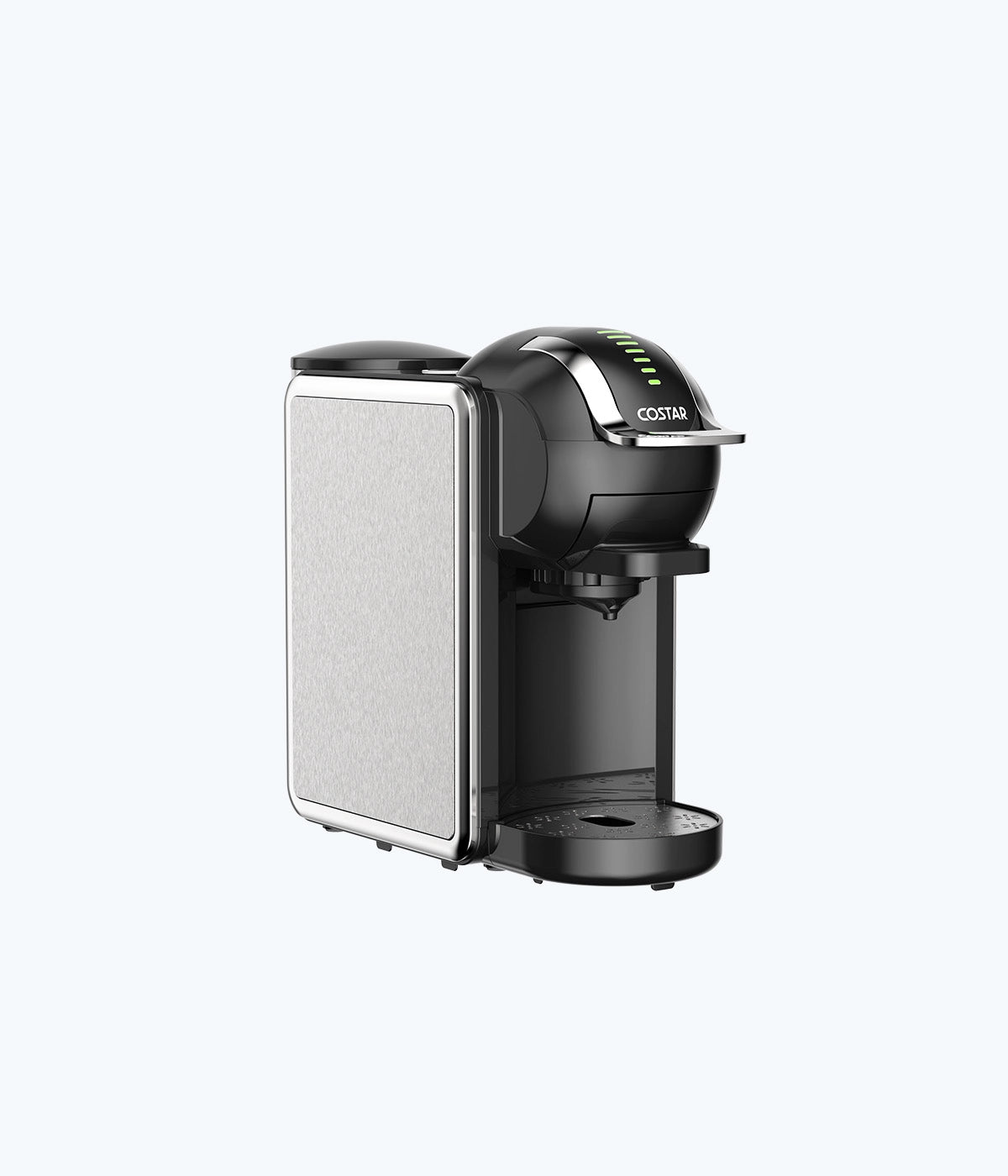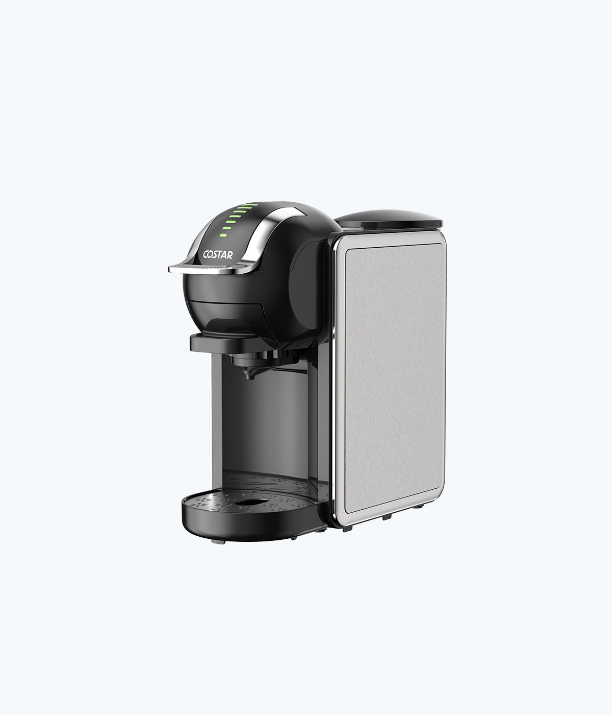 Brews Nespresso, DG capsules, and coffee powder.
